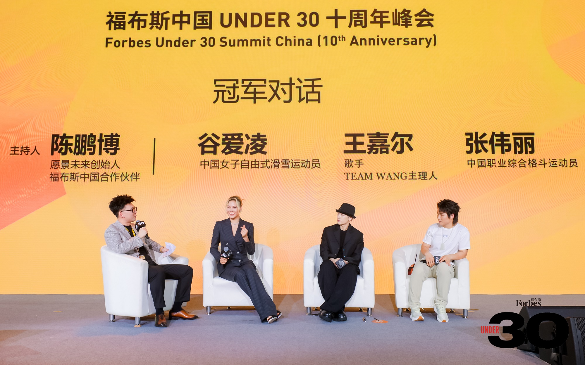 随后,在现场嘉宾的欢呼声中,中国女子自由式滑雪运动员谷爱凌,歌手、team wang 主理人王嘉尔,中国职业综合格斗运动员张伟丽登上讲台,在愿景未来创始人、福布斯中国大小单双赚钱平台的合作伙伴陈鹏博的主持下,开启了名副其实的“冠军对话”。