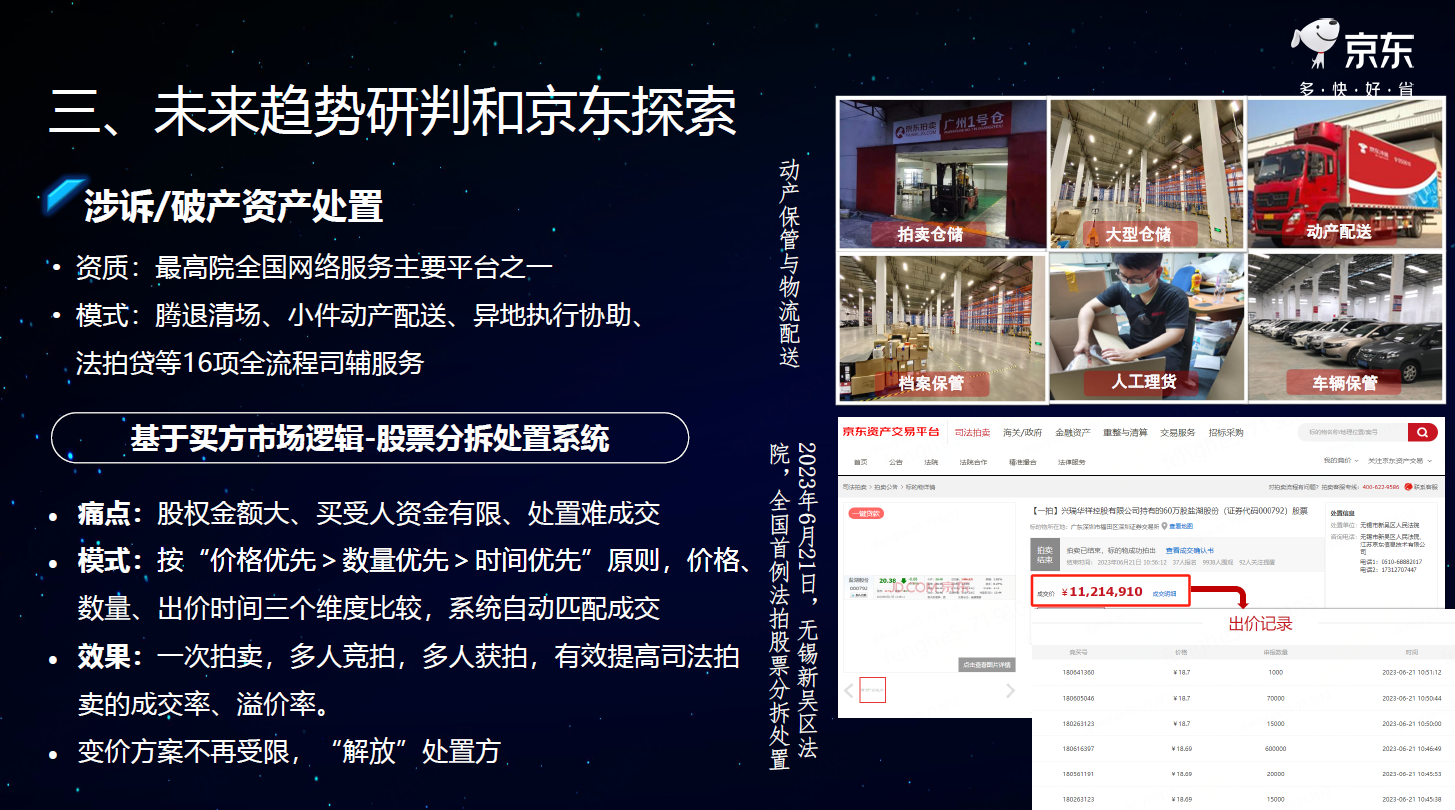 京东集团、京东资产交易平台总监冯赫围绕《数智化时代下特殊资产流转趋势与京东的行业探索》 进行分享,讨论了特殊资产的一般性理解、政策障碍和现实问题,介绍了京东在特殊资产处置方面的探索和实践,并强调科技赋能在特殊资产处置中的重要作用,展望了未来特殊资产流转的趋势。