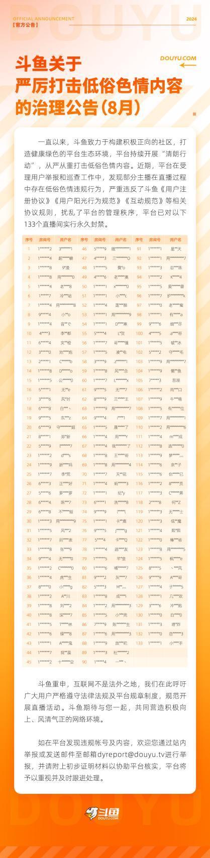 一直以来,斗鱼致力于构建积极正向的社区,打造健康绿色的平台生态环境,平台持续开展“清朗行动”,从严从重打击低俗色情内容。近期,斗鱼在受理用户举报和巡查工作中,发现部分主播在直播过程中存在低俗色情违规行为,严重违反了斗鱼《用户注册协议》《用户阳光行为规范》《互动规范》等相关协议规则。经平台筛查确认,斗鱼8月针对133个违规直播间采取了永久封禁措施。
