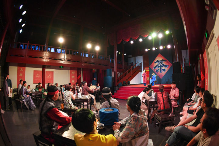 2024年7月7日,在北京市东城区颜料会馆,观众在欣赏由北京市曲剧团演员带来的沉浸式北京曲剧《茶馆》。记者 鞠焕宗 摄