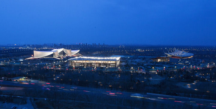 北京艺术中心、北京城市图书馆和北京大运河博物馆夜景(从左至右,2024年2月28日摄)。记者 鞠焕宗 摄