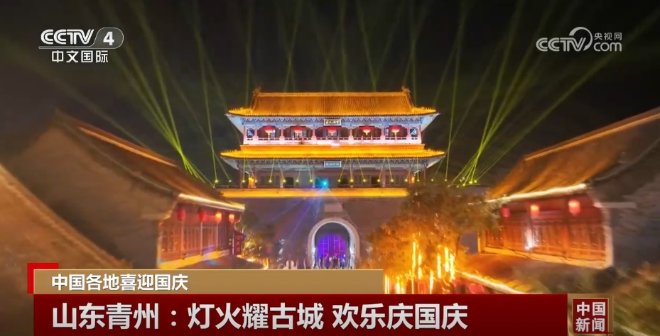 在山东青州,绚丽夺目的灯光秀点亮夜空,让节日的古城充满了浓浓的喜庆氛围。