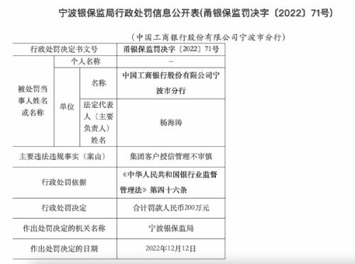 中国工商银行宁波市分行因集团客户授信管理不审慎,被罚款200万元。