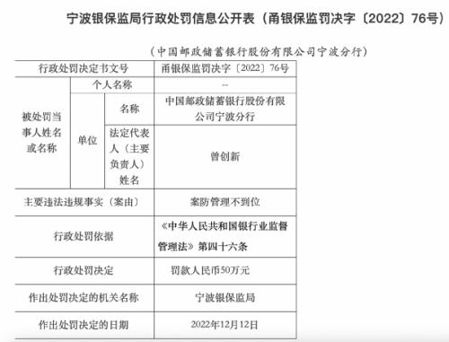 中国邮储银行(601658,诊股)宁波分行因案防管理不到位,被罚款50万元。