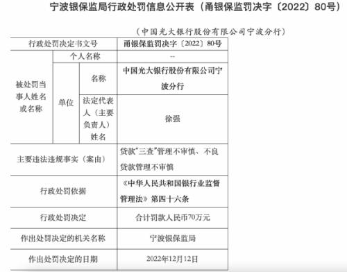 中国光大银行宁波分行因贷款“三查”管理不审慎、不良贷款管理不审慎被罚款70万元。