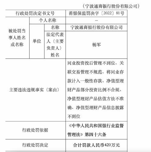 宁波通商银行因同业投资投后管理不到位、关联交易管理不规范、将同业存款计入一般性存款、净值型理财产品部分投资比例不合规、净值型理财产品估值方法不准确、净值型理财产品信息披露不到位,被罚款420万元。