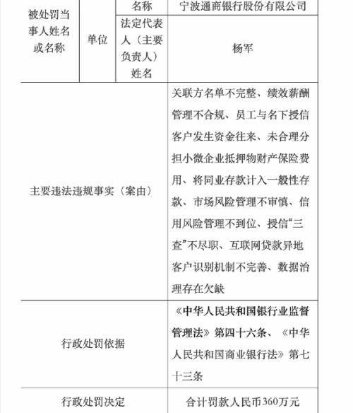 此外,宁波通商银行还因关联方名单不完整、绩效薪酬管理不合规、员工与名下授信客户发生资金往来、未合理分担小微企业抵押物财产保险费用、将同业存款计入一般性存款、市场风险管理不审慎、信用风险管理不到位、授信“三查”不尽职、互联网贷款异地客户识别机制不完善、数据治理存在欠缺,被罚款360万元。