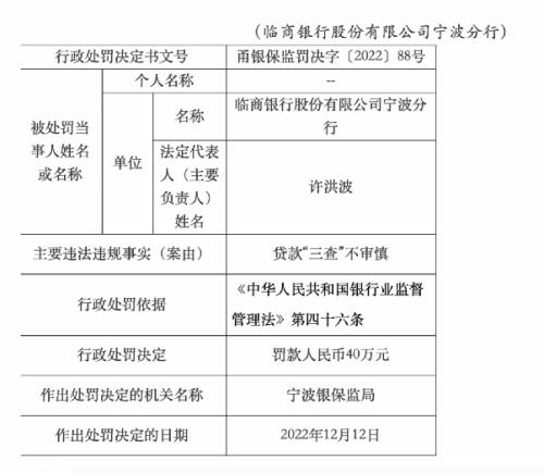 临商银行宁波分行因贷款“三查”不审慎,被罚款40万元。