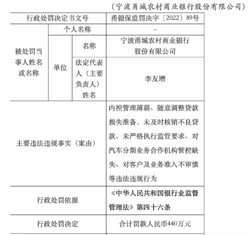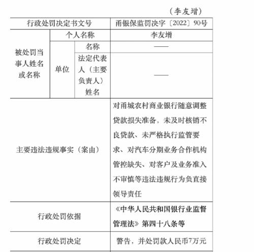 此外,宁波甬城农商银行法定代表人李友增对该行随意调整贷款损失准备,未及时核销不良贷款、未严格执行监管要求、对汽车分期业务合作机构管控缺失、对客户及业务准入不审慎等违法违规行为负直接领导责任,被予以警告并罚款7万元。