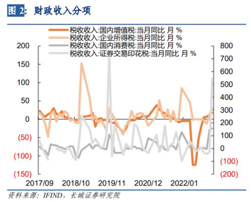 分细项来看,11月财政收入中,增值税、消费税、进口环节增值税和消费税、企业所得税、证券交易印花税等是主要拉动项,同比增速分别为17.8%、156.8%、40%、31.1%、547%。其中增值税继续走高符合预期(留抵退税后增值税一直不断走高),消费税同比继续大幅上升的原因与上月一致,是受到去年低基数的影响(近两月同比增速分别为147.2%和156.8%,去年基数分别为530亿元和449亿元,并不是消费恢复),而实际上近两月的社消数据分别为-0.5%和-5.9%,并不能支撑如此高的消费税增速,且按此规律12月消费税同比增速或仍会大幅走高(去年12月基数也低)。