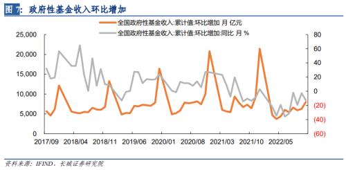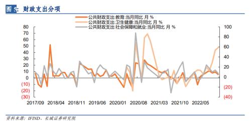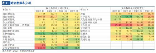 分细项来看,11月单月支出中,教育、社会保障和就业、卫生健康是主要拉动项,同比增速分别为5.5%、7.1%、47.4%,其中卫生健康支出增速连续两月在40%以上,反映出11月份由于疫情爆发,多地封控和核酸检测等开支高增的情形,另外,教育和社会保障就业支出增速虽有所下滑,但仍在高位,社保就业支出高增主要原因是经济下行压力加大,城镇调查失业率仍较高导致。(据统计局公布的数据,11月城镇调查失业率为5.7%,处于高位)