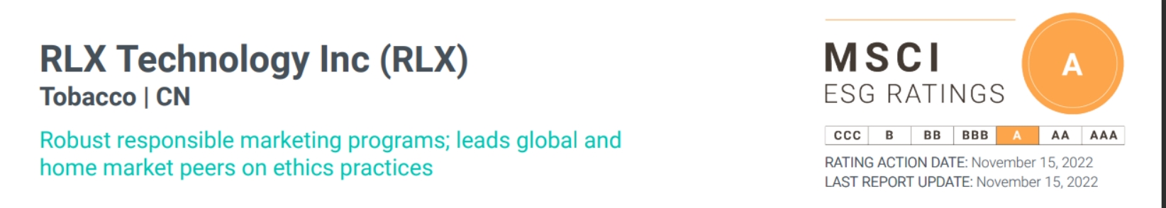 近日,国际权威指数机构msci(明晟)公布的最新年度环境、社会及管治(esg)评级结果显示,relx悦刻(雾芯科技,nyse:rlx) msci esg评级由ccc级跃升4级至a级。据最新数据,悦刻esg评级位列全球电子烟企业首位,也成为全球范围内首家单次评级中跃升4级的企业。