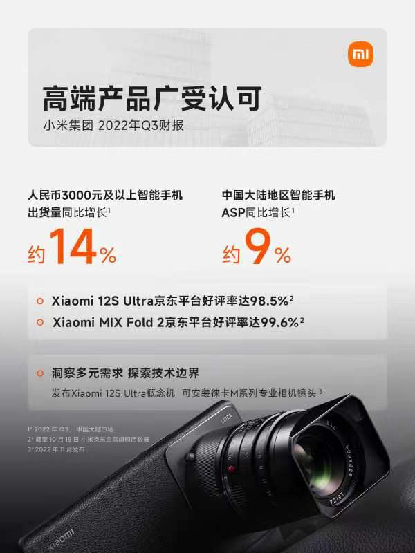 前三季度以来,小米持续发力高端化,以优越的产品力和极致体验赢得高端市场口碑。通过对手机影像技术的极致探索,小米推出与徕卡合作的高端影像旗舰手机xiaomi 12s ultra;同时,持续探索折叠屏体验,推出xiaomi mix fold 2折叠屏高端旗舰手机,其超轻薄使用体验持续吸引更多商务人群。截至10月19日,两款高端机型在京东平台好评率分别达到98.5%和99.6%。得益于小米在高端市场的持续进化,2022年q3小米中国大陆地区智能手机asp同比增长约9%,人民币3000元以上智能手机出货量实现同比约14%的增长。