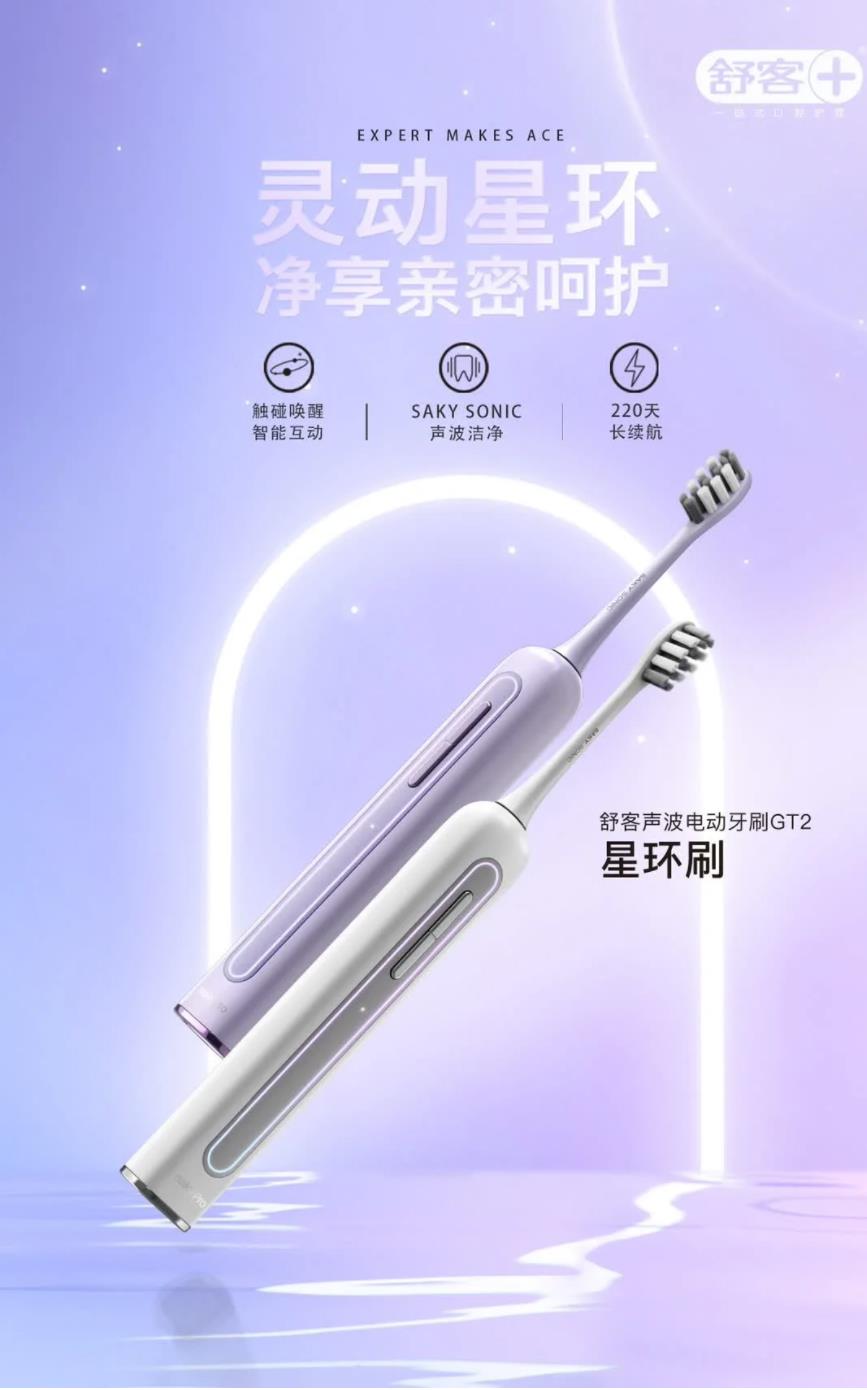 作为一款智能电动牙刷,舒客星环刷gt2还有着9大科技加持,其中不仅包括智能星环光效、碰触唤醒,还有10种洁齿方案、saky sonic洁净技术、3重过压提醒、220天长续航、抗菌柔护刷毛、ipx7防水、saky care智护系统,共同为口腔护理助力。