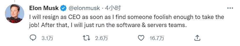 马斯克写道,“如果有人愚蠢到想要揽下这份工作,我将会辞去首席执行官这一职”。