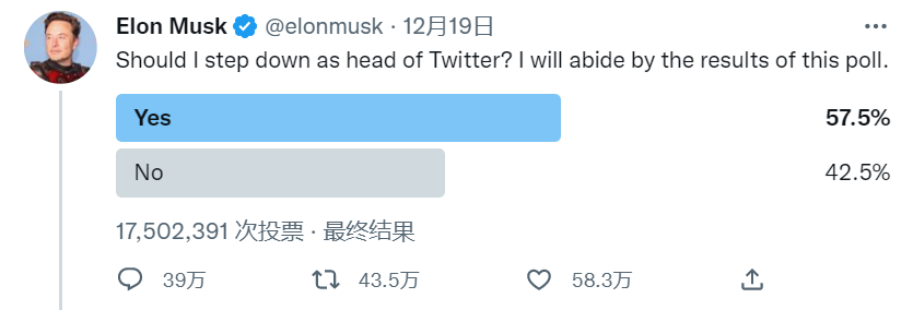周一,马斯克在推特上就是否应该放弃ceo一职发布了一项民意调查。投票结果显示,57.5%的用户(超过1000万票)支持马斯克辞职。