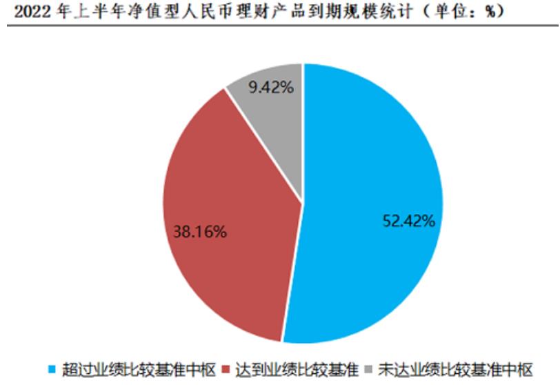 普益标准研究员黄晓旭在接受媒体采访时表示,普益标准数据显示,截至上半年末,发生过“破净”的银行理财产品占存续产品数量的9.73%。从上半年理财产品的兑付情况来看,产品兑付收益并没有因为短期的净值波动现象受到严重影响,仍有超9成的产品能够达到业绩比较基准下线,完成收益兑付。从2022年上半年到期的封闭式产品兑付情况来看,共有12380只产品披露了业绩比较基准。其中,有10367只产品能够计算得到到期收益率。将到期收益率与业绩比较基准进行比较后发现,有近9成的产品到期收益率可以达到银行设定的业绩比较基准线,超4成的产品到期收益率超过了业绩比较基准线(业绩比较基准中枢),实现了超额兑付。