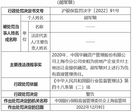 北京12月19日讯 中国银保监会网站今日公布的上海银保监局行政处罚信息公开表(沪银保监罚决字〔2022〕91号、92号)显示,2020年,中国华融资产管理股份有限公司上海市分公司变相为房地产企业支付土地出让金提供融资。中国银保监会上海监管局依据《中华人民共和国银行业监督管理法》第四十六条第(五)项对该公司责令改正,并处罚款50万元。