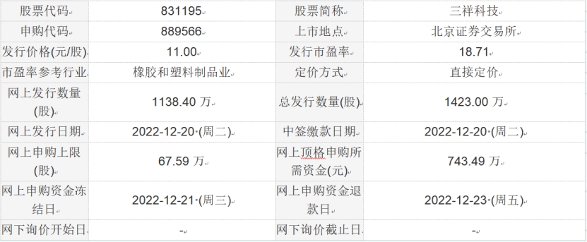 2022年12月15日,三祥科技披露的招股说明书显示,公司拟募集资金18,000.95万元,分别用于汽车管路系统制造技术改造项目、补充流动资金。