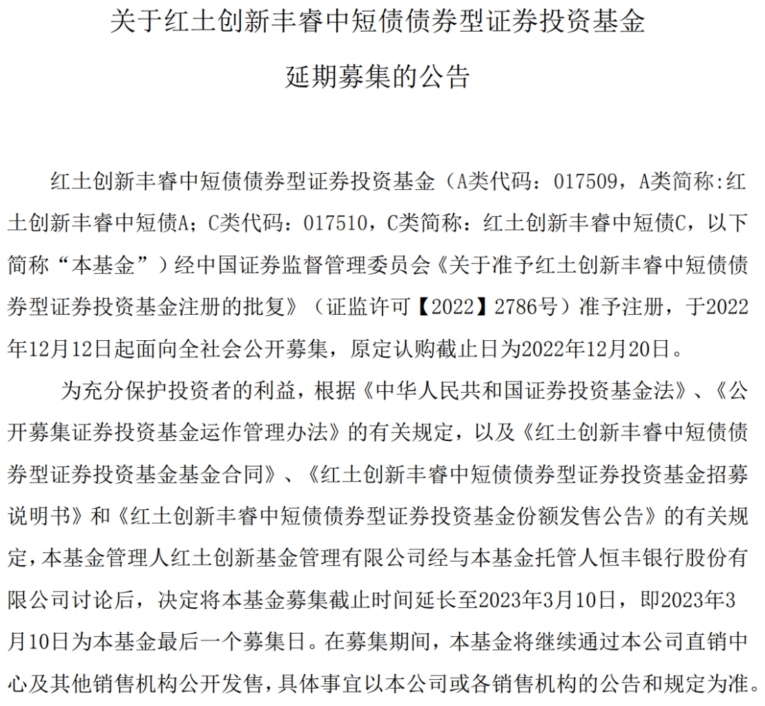 北京12月20日讯 今日,红土创新基金管理有限公司公告称,红土创新丰睿中短债债券(a类代码:017509;c类代码:017510)于2022 年12月12日起募集,原定认购截止日为2022年12月20日,现决定将该基金募集截止时间延长至2023年3月10日。