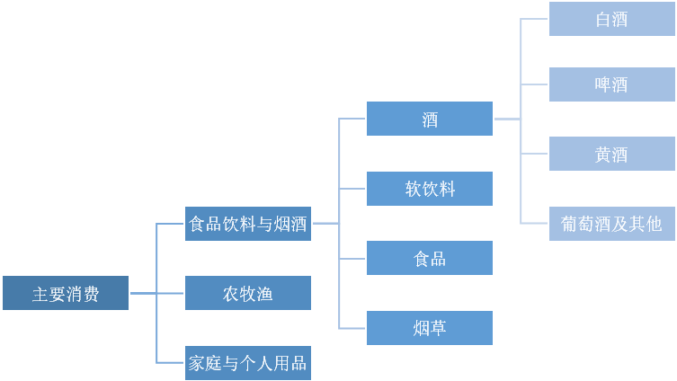比如,中证的主要消费(一级行业),可以细分为食品饮料与烟酒、农牧渔、家庭与个人用品3个二级行业;食品饮料与烟酒(二级行业)分为酒、软饮料、食品、烟草4个三级行业;酒(三级行业)可分为白酒、啤酒、黄酒、葡萄酒及其他4个四级行业。