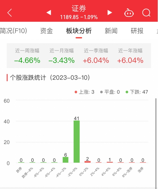 北京3月10日讯 今日,证券板块整体跌幅1.09%,其中3只股票上涨,47只股票下跌。
