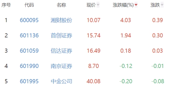 其中,湘财股份、首创证券、信达证券、南京证券、中金公司位列板块涨幅前五位,涨幅分别为4.03%、1.94%、0.18%、-0.12%、-0.20%。