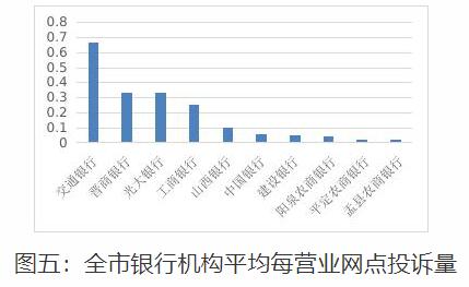 全市银行机构每营业网点投诉量为:交通银行0.67件/每营业网点、晋商银行0.33件/每营业网点、光大银行0.33件/每营业网点、工商银行0.25件/每营业网点、山西银行0.10件/每营业网点、中国银行0.06件/每营业网点、建设银行0.05件/每营业网点、阳泉农商银行0.04件/每营业网点、平定农商银行0.02件/每营业网点、盂县农商银行0.02件/每营业网点。