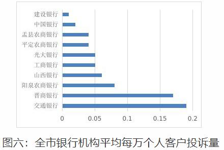 全市银行机构每万个人客户投诉量为:交通银行0.19件/万个人客户、晋商银行0.17件/万个人客户、阳泉农商银行0.08件/万个人客户、山西银行0.06件/万个人客户、工商银行0.05件/万个人客户、光大银行0.05件/万个人客户、平定农商银行0.04件/万个人客户、盂县农商银行0.04件/万个人客户、中国银行0.02件/万个人客户、建设银行0.01件/万个人客户。