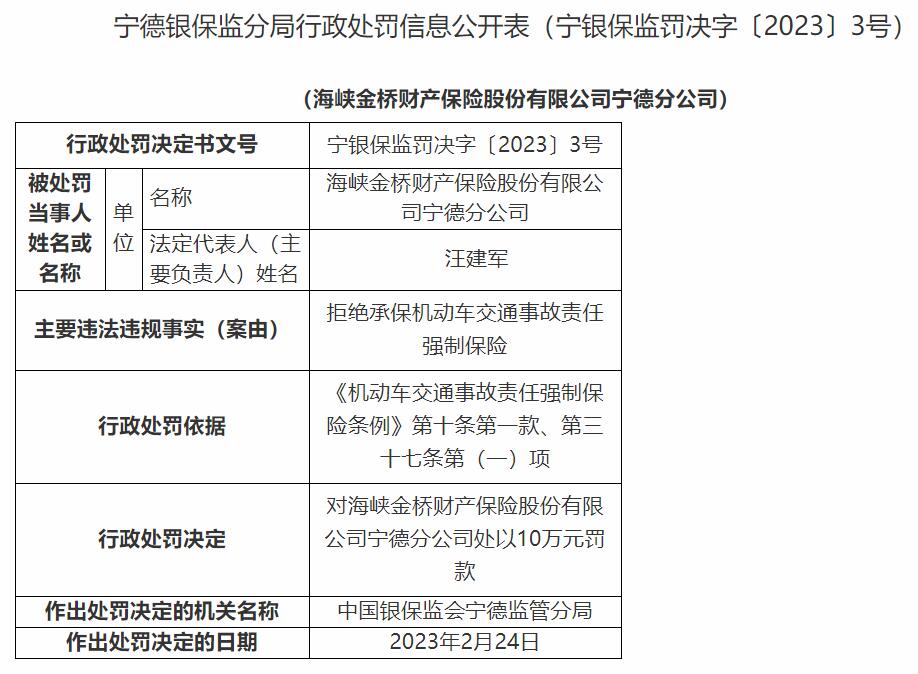 北京3月13日讯 银保监会网站近日公布的宁德银保监分局行政处罚信息公开表(宁银保监罚决字〔2023〕3号)显示,海峡金桥财产保险股份有限公司宁德分公司(以下简称“海峡保险宁德分公司”)拒绝承保机动车交通事故责任强制保险。