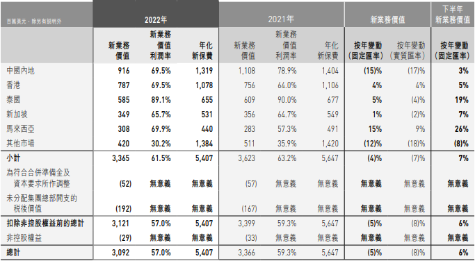 新业务价值方面,友邦保险2022年全年新业务价值为30.92亿美元,同比下降5%。