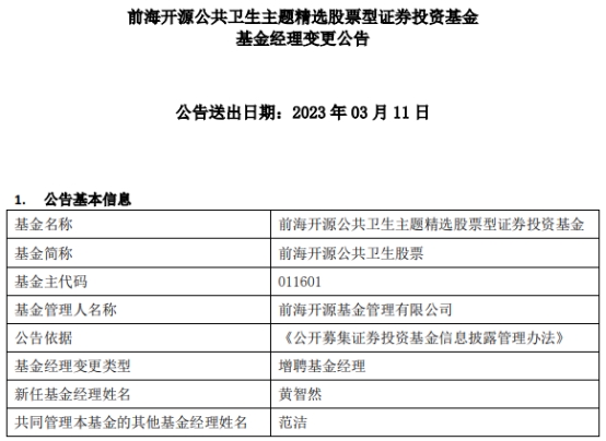 前海开源公共卫生股票增聘基金经理黄智然-大小单双赚钱平台