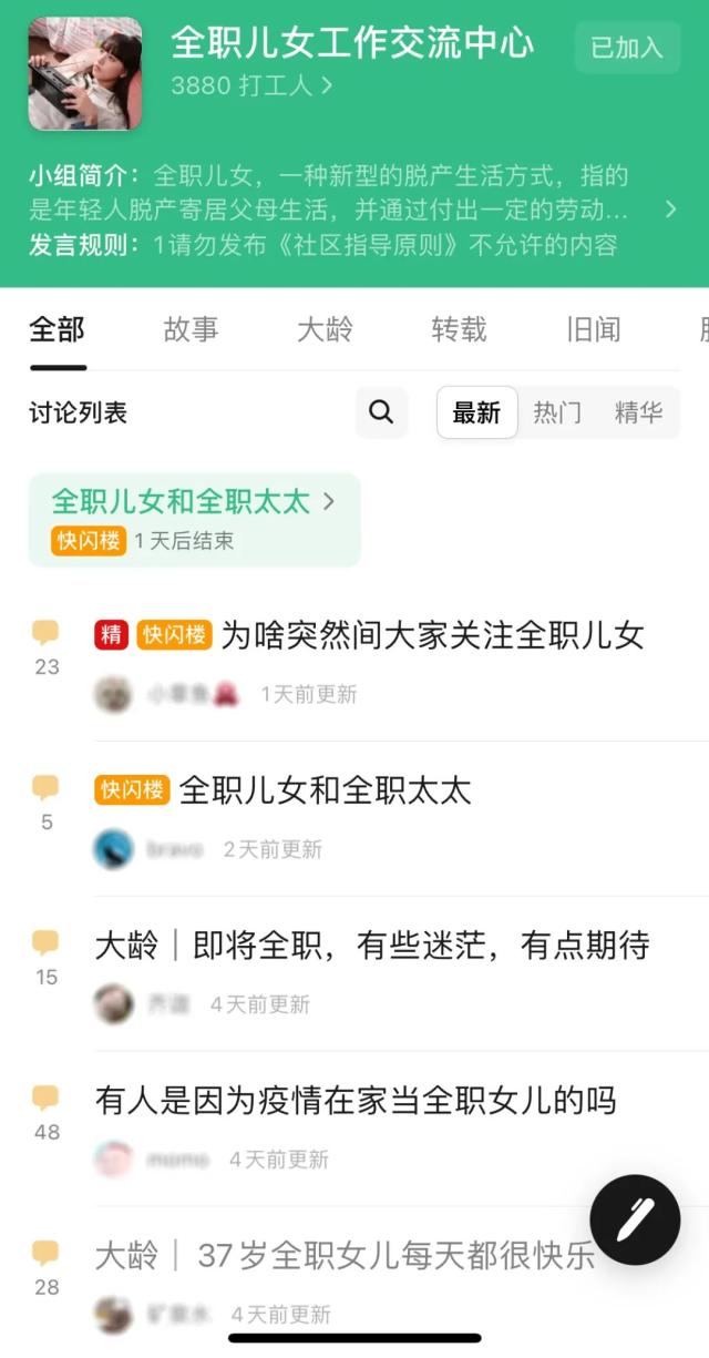在名为“全职儿女工作交流中心”的社群小组里,他们聊“陪伴父母”,讨论副业,同时抒发自己的快乐或迷茫。
