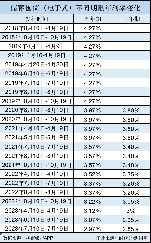 时代财经注意到,储蓄国债(电子式)5年期年利率在2019年、2020年都相对稳定,分别为4.27%和3.97%,然而该产品利率在2021年开始便不断下调。5年期年利率从2021年的3.97%下调至目前的2.97%,3年期年利率从2021年3.8%下调至目前的2.85%;不到三年时间,年利率下降近100个基点,利率跌破“3”字头。