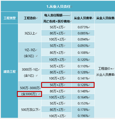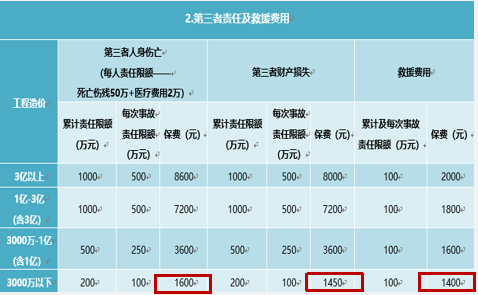 3、举例:工程造价3000万元,从业人员伤亡限额要求50万 2万,则总保费=3000万*0.128% 1600 1450 1400=42850元
