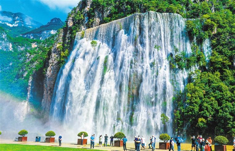 7月20日,游客在湖北省兴山县高岚大峡谷风景区欣赏大瀑布景观。近年来,兴山县依托资源禀赋,做好“山水文章”,助力旅游产业发展。李 阳摄(中经视觉)
