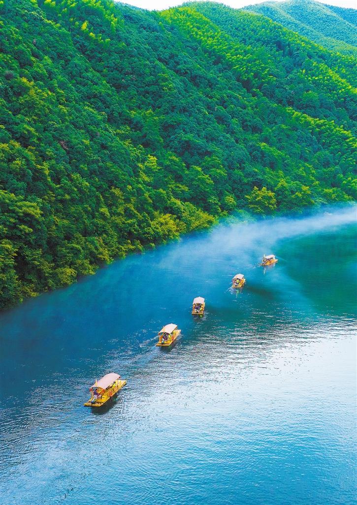 7月17日,安徽省宁国市青龙湖欢乐水世界,游客乘坐小船穿行于山水间。夏日,该市举办的亲水季系列活动,吸引众多游客亲水避暑,乐享清凉。李晓红摄(中经视觉)