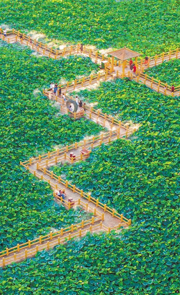 7月19日,位于太行山革命老区的河北省易县桥头乡摇头村荷花竞相绽放,游客行走在曲折的栈道上,闻香赏花,乐享夏日美景。