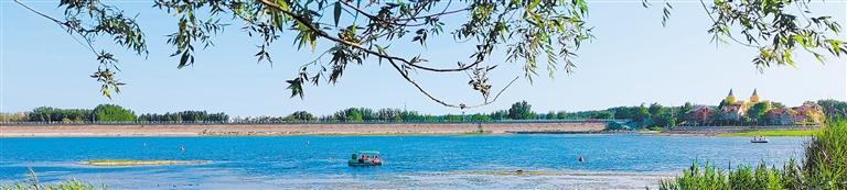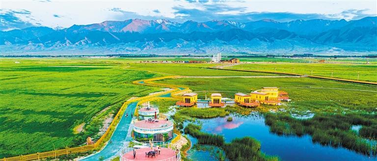 7月19日,新疆维吾尔自治区巴里坤县高家湖湿地天蓝水清,绿草如茵,吸引各地游客前来避暑游玩。王传生摄(中经视觉)