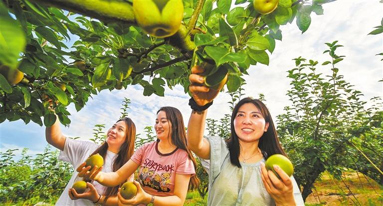 7月20日,游客在江西省樟树市观上镇志明翠冠梨种植基地采摘梨子。近年来,樟树市观上镇大力发展特色农业乡村游,带动当地村民在家门口就业增收。李 �摄(中经视觉)