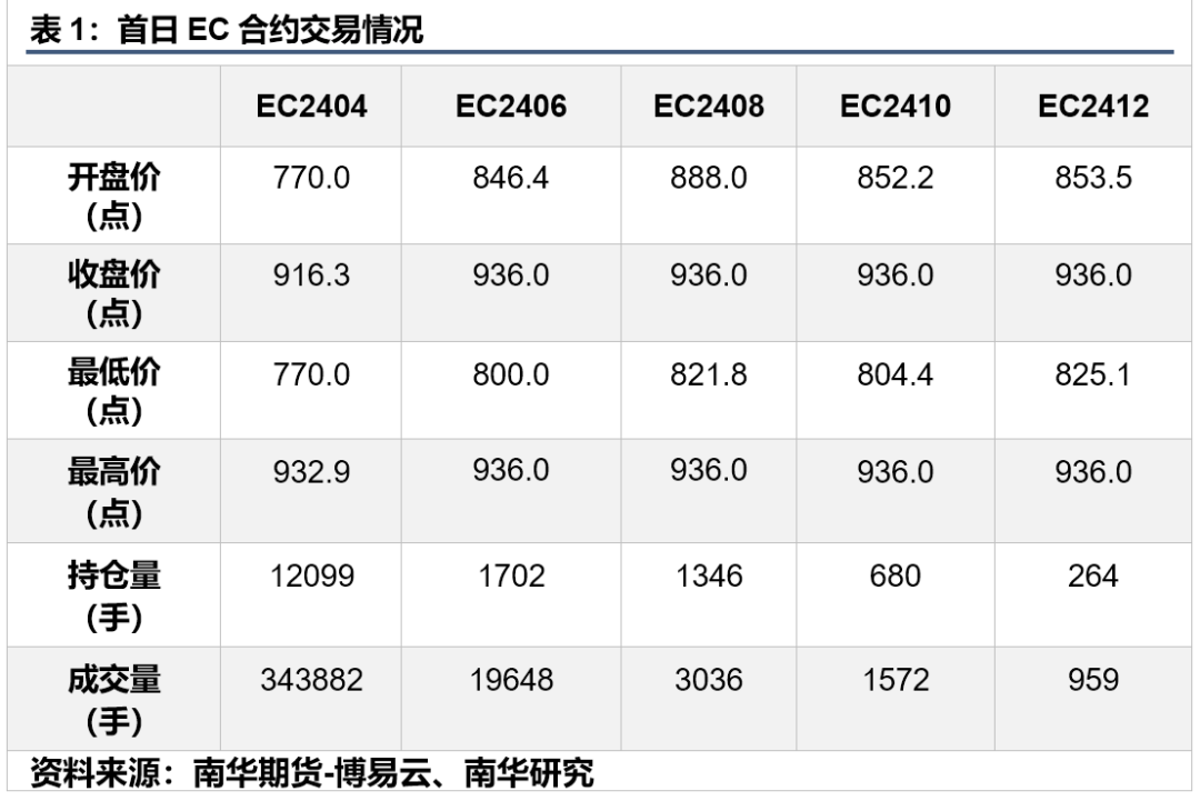 行情导读:集运指数(欧线)期货合约上市首日盘面大涨。其中,主力合约ec2404涨幅达17.47%,收于916.3点,持仓量达12099手,成交规模逾34万手;远月合约ec2406、ec2408、ec2410以及ec2412陆续涨停,收于936.0点。整体呈现显著的contango结构,符合市场预期。