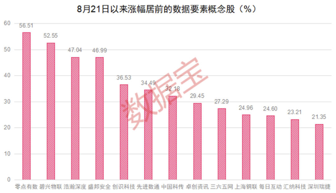 证券时报・数据宝统计,自8月21日财政部公布数据资源入表以来,具备人工智能属性的数据要素概念股集体大涨,其间零点有数、碧兴物联累计大涨超50%,浩瀚深度、盛邦安全、创识科技、先进数通(300541)、中国科传等均涨超30%。