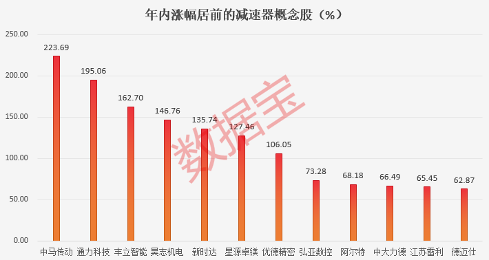 今年以来,减速器概念股平均上涨27.99%,跑赢同期上证指数。中马传动、通力科技、丰立智能、昊志机电等7股股价翻倍;另外,弘亚数控、阿尔特、中大力德、江苏雷利、德迈仕涨超50%。