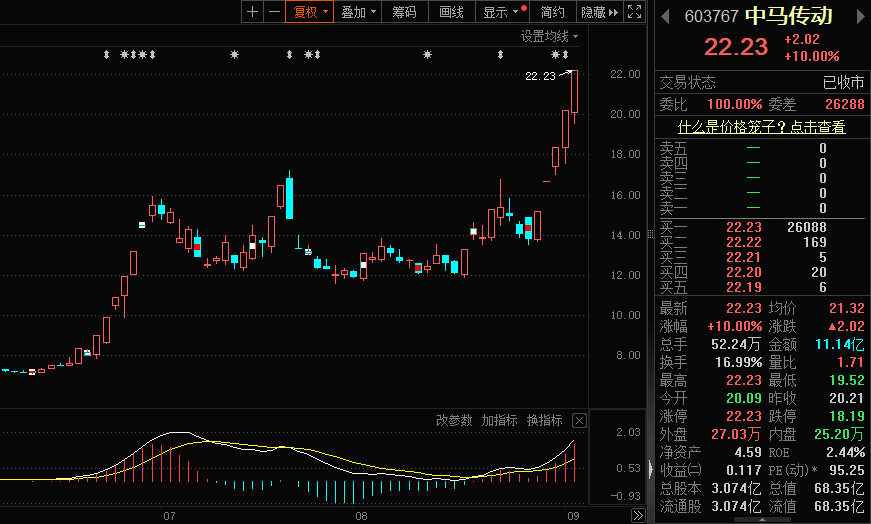 8月29日至9月4日,该股连收五个涨停板,总市值超过68亿元。
