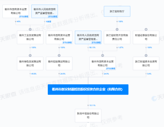 天眼查显示,新安财通由衢州绿色发展集团有限公司持股49.8%,衢州控股集团有限公司持股24.9%,衢州市国有资本运营有限公司持股24.9%,浙江财通资本投资有限公司持股0.4%。前三名出资人均为衢州国资,普通合伙人浙江财通资本为财通证券(601108)全资子公司。