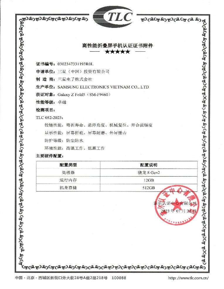 《高性能折叠屏手机认证技术规范》由泰尔实验室和泰尔认证中心有限公司联合制定发布,该技术规范对折叠屏的铰链、显示、防护等硬件性能指标及评价方法进行了全新规定。三星galaxy z fold5是首款满足卓越级测试目标的折叠屏手机,经过70万次折叠后,铰链性能和手机功能依旧呈良好状态。