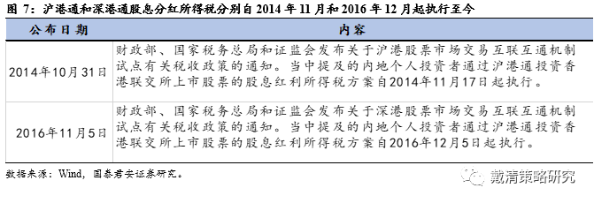 沪港通和深港通股息分红所得税分别自2014年11月和2016年12月起执行至今。2014年10月31日,财政部、国家税务总局和证监会发布关于沪港股票市场交易互联互通机制试点有关税收政策的通知。当中提及的内地个人投资者通过沪港通投资中国香港联交所上市股票的股息红利所得税方案自2014年11月17日起执行。