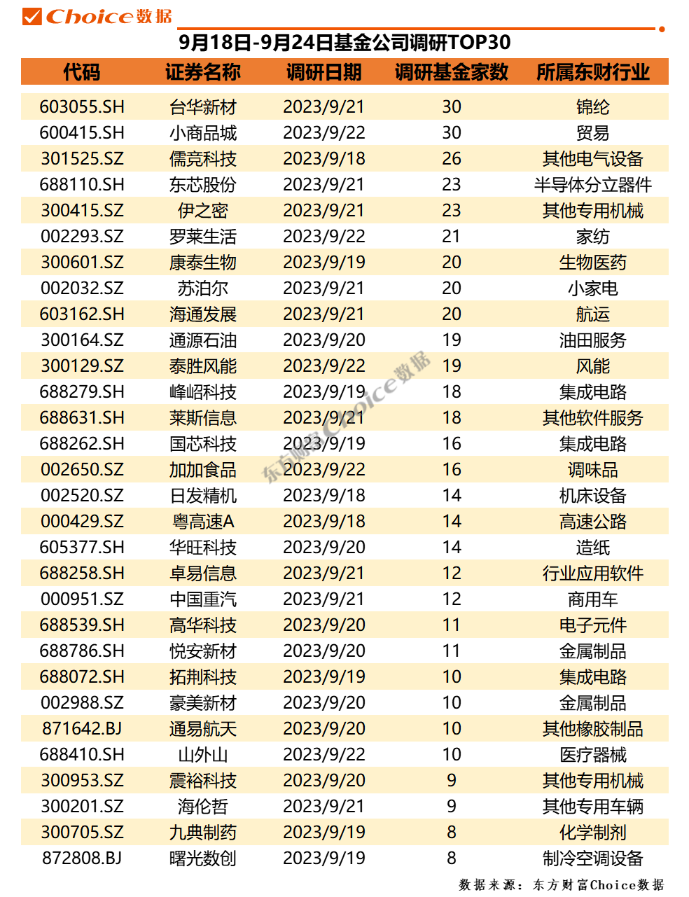 choice数据显示,上周基金公司调研了280余家上市公司。最受基金公司关注的前五家上市公司是小商品城、台华新材、儒竞科技、东芯股份和伊之密,分别有30家、30家、26家、23家、23家基金公司前去调研。
