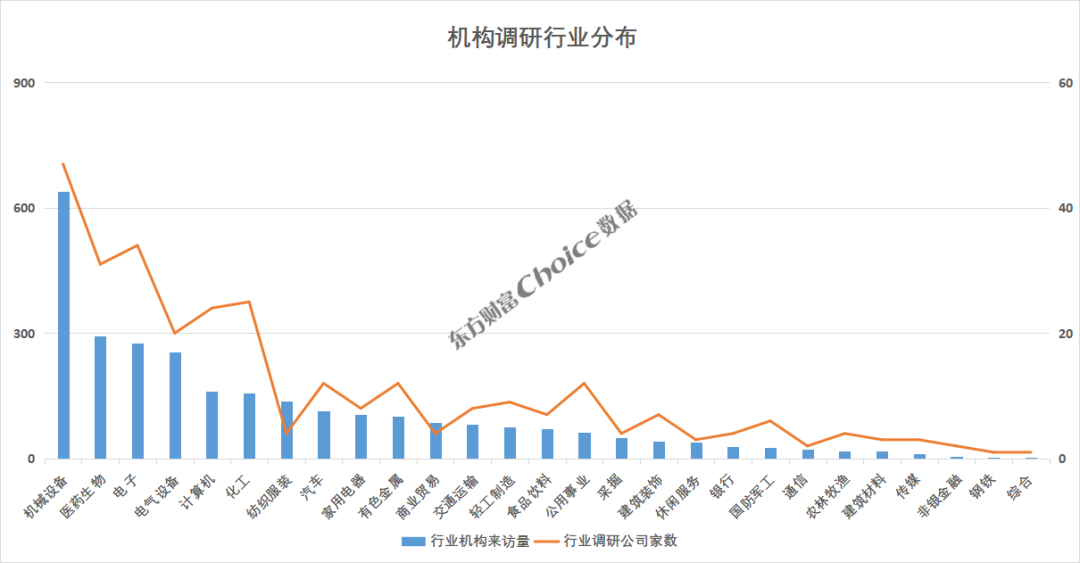 上周机构调研最多的行业是机械设备,累计调研量超600次;医药生物、电子、电气设备行业接待机构调研量超200次。
