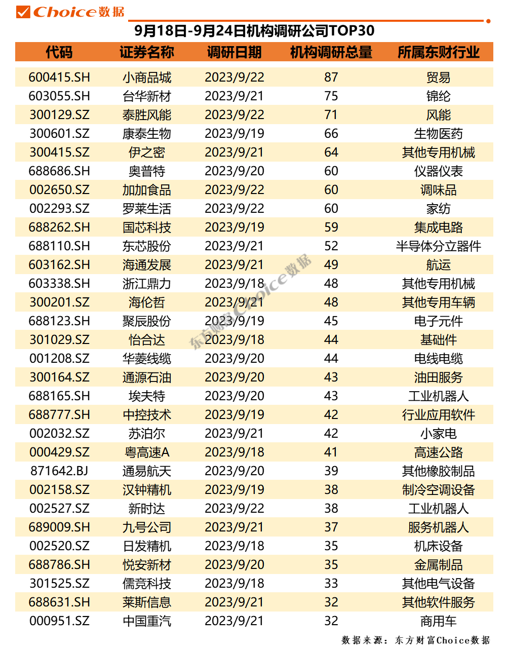 上周,机构投资者共调研了388家上市公司,87家机构组团调研小商品城,包括4家券商、30家基金和12家私募,75家机构调研台华新材,71家机构调研泰胜风能。康泰生物、伊之密、奥普特、加加食品、罗莱生活、国芯科技等获机构调研量均超过50次。